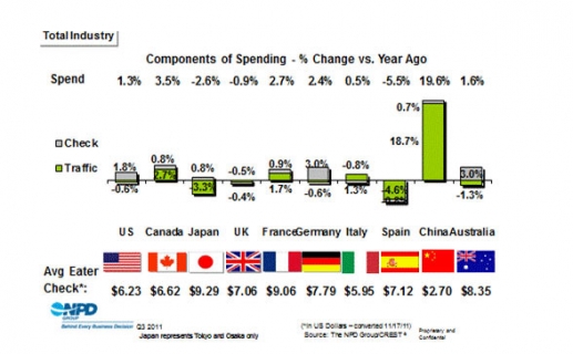 Interessanti dati sull'andamento delle visite e della spesa al ristorante (et similia) in Italia, Francia, Spagna, Stati Uniti, Canada, Cina nel quarter di settembre-dicembre 2011.