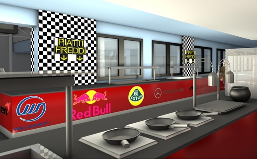 Progettazione dell'area free-flow del ristorante, ideazione delle scenografie in stile "grand prix" e sviluppo dell'arredamento del nuovo Punto Ristoro adiacente al simulatore I-SPEED nel parco Mirabilandia a Ravenna.